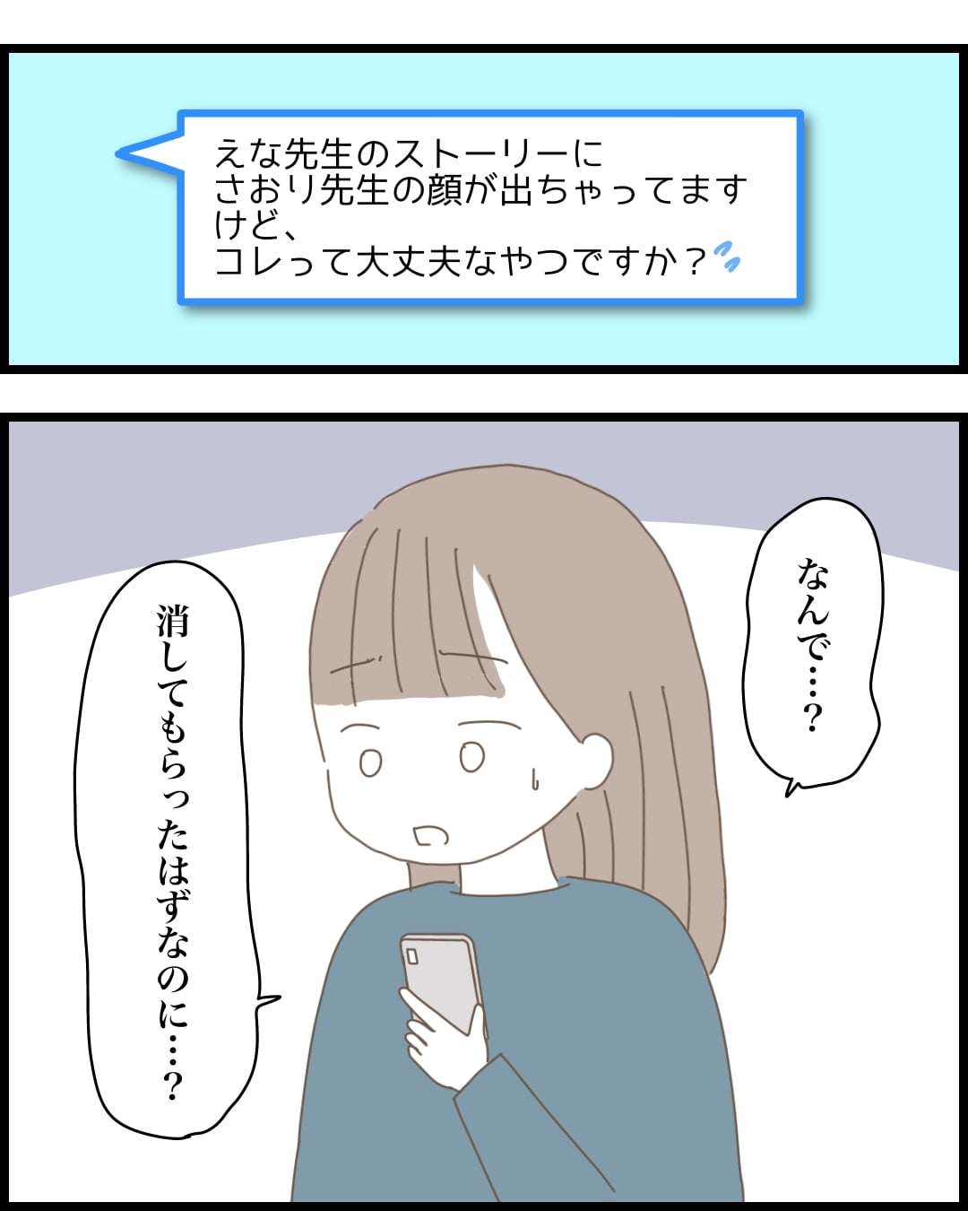 さおりの写真を勝手にアップしたえな。ひとまず消してくれてホッとしたところに、今度ははるか先生からメッセージが届いて…?