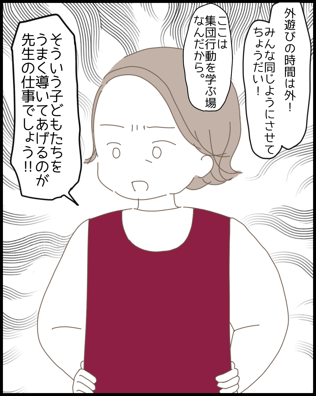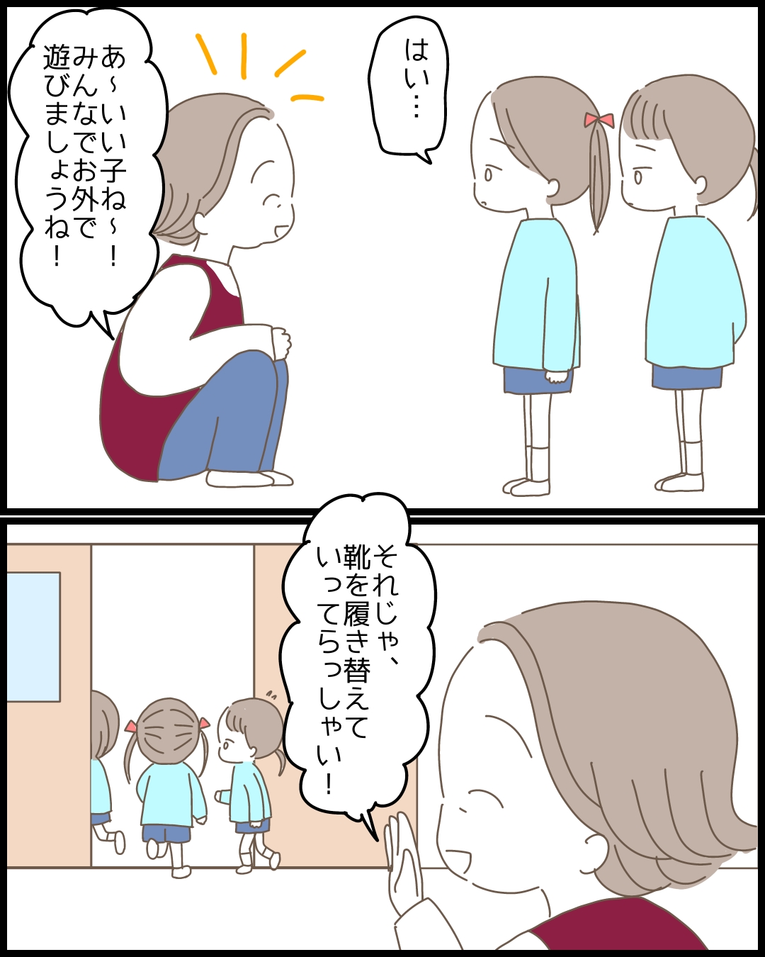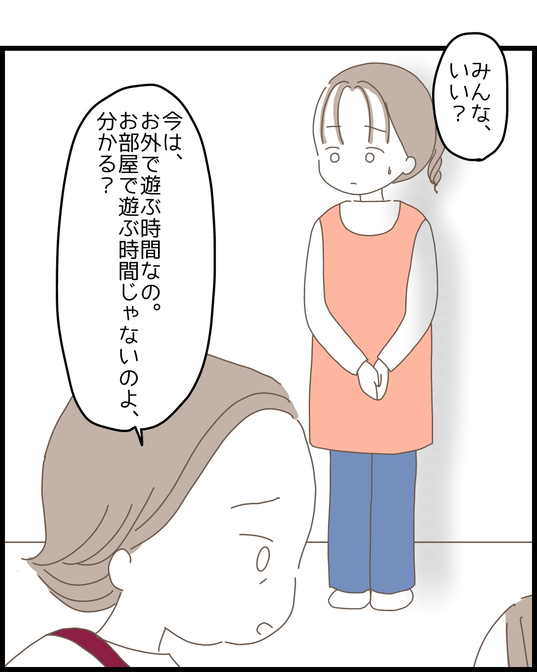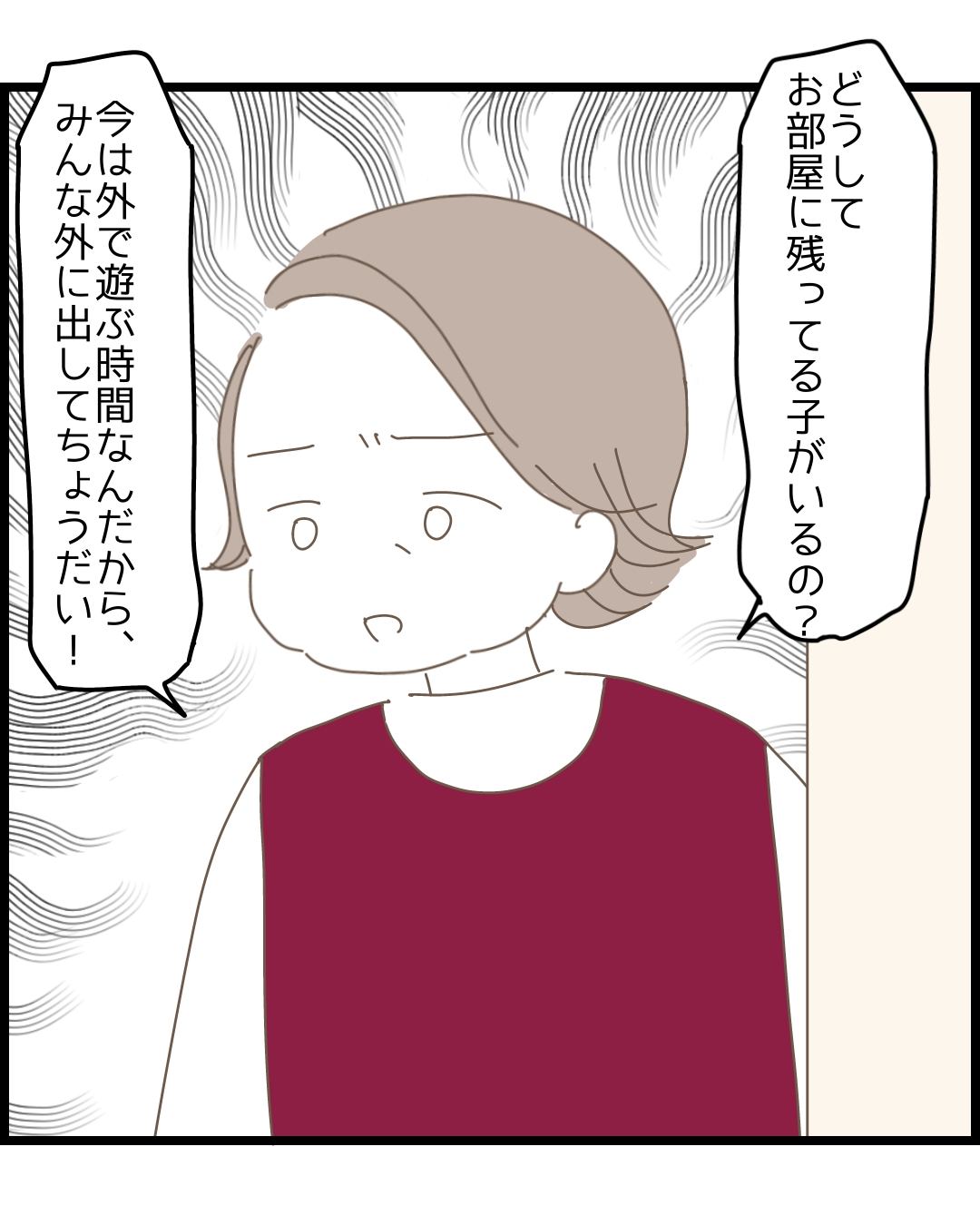 お部屋で遊びたいという気持ちに寄り添うことなく、問答無用に子どもたちを外に出す はなこ先生。