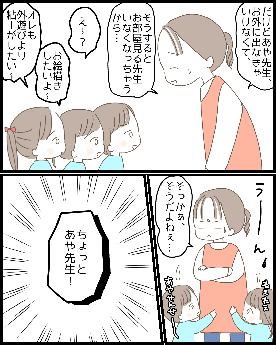 「お部屋に残りたい」と言う子どもたちを前に困っていると、はなこ先生がやってきて…。