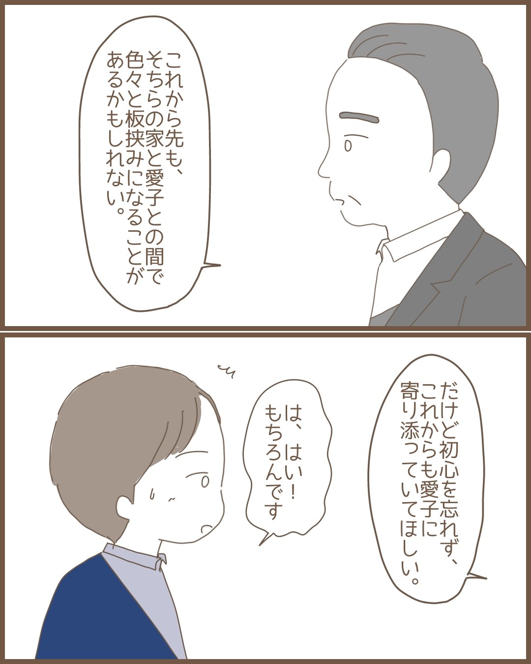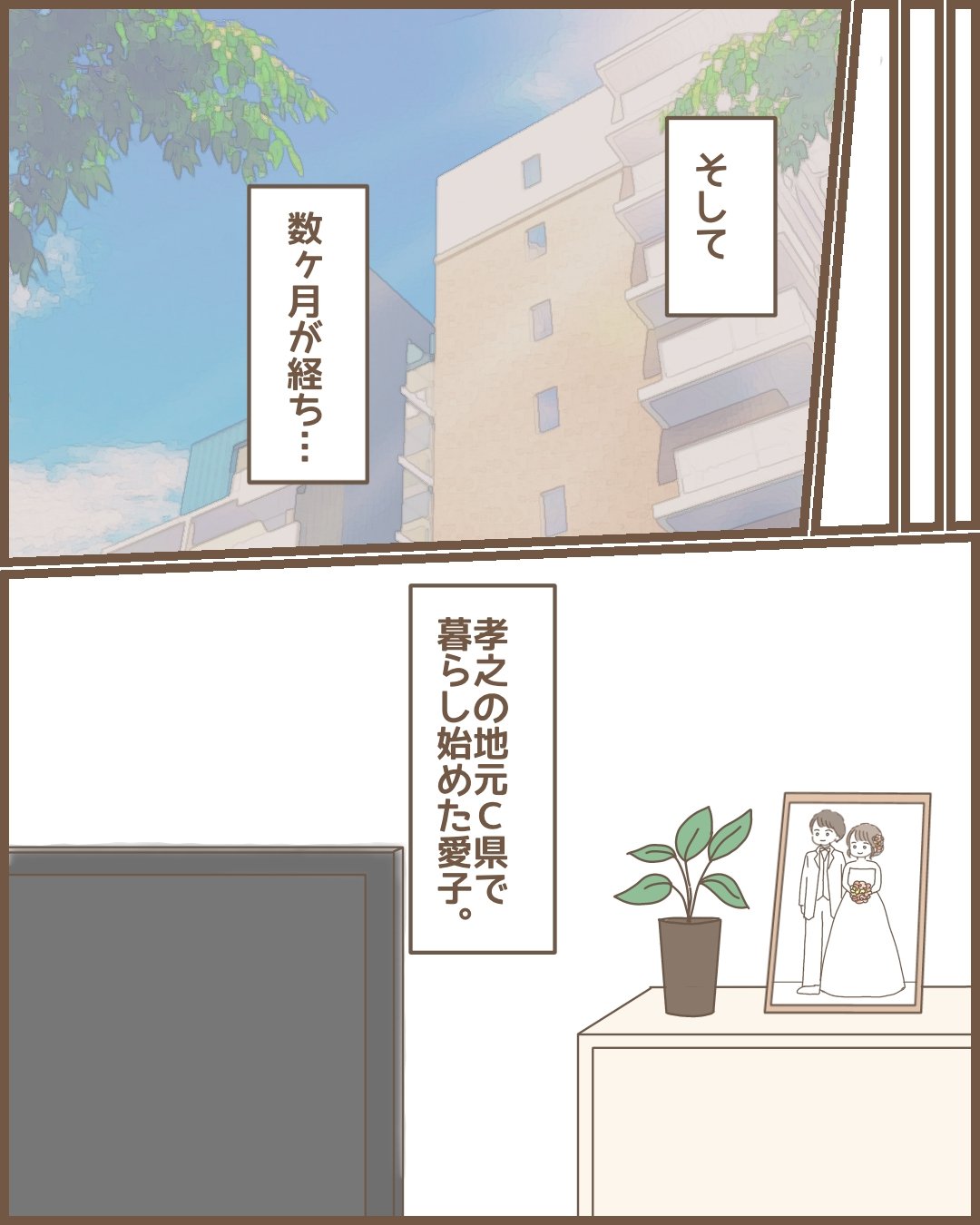自分中心な振る舞いが多い義母に戸惑いを隠せなかった愛子でしたが、両親の後押しと孝之を信じて孝之の地元で結婚生活をスタートさせたのでした。